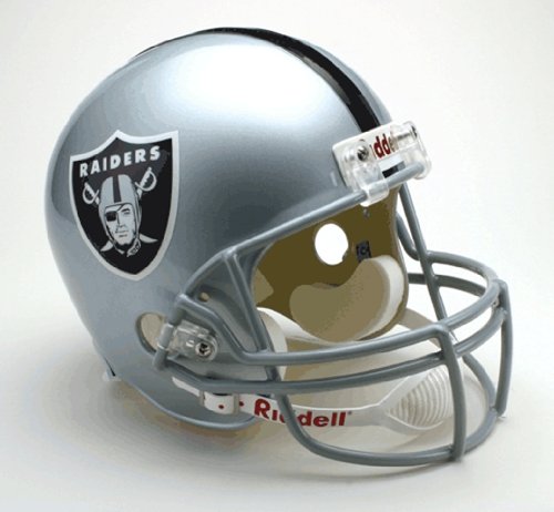 Oakland Raiders full size football helmet. NFL Riddell helmet features painted full-size shell with steel polyvinyl-coated face mask and replica decals. Not for competitive play. This is an affordable display piece for the true fan. A full-size helmet with decorative pads and 2-point chinstrap. A great helmet at a great value. Perfect for display or autographs. Helmet has metal bar inside to prevent wear. Go Raiders! Read more...